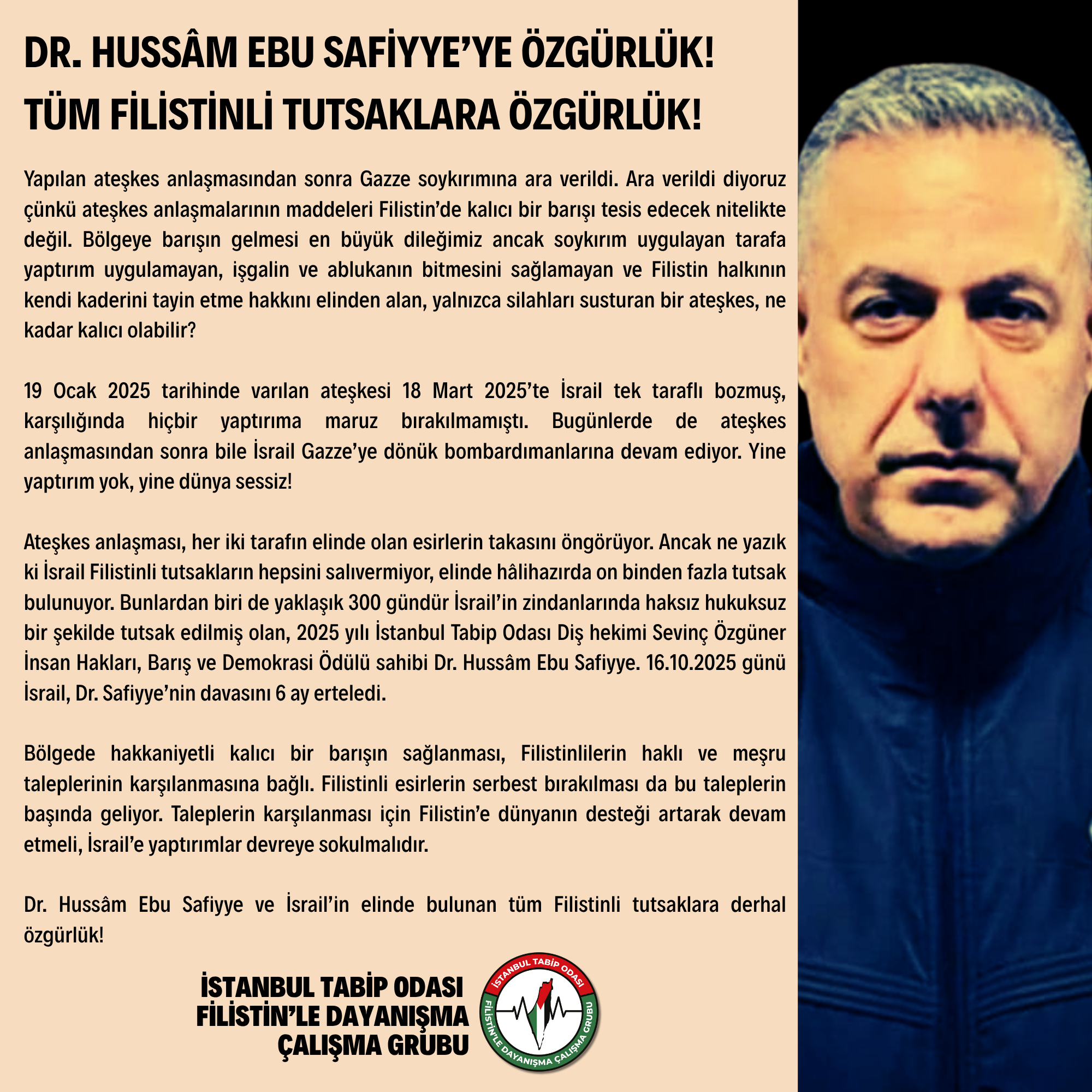 Ateşkes anlaşması, her iki tarafın elinde olan esirlerin takasını öngörüyor. Ancak ne yazık ki İsrail Filistinli tutsakların hepsini salıvermiyor, elinde hâlihazırda on binden fazla tutsak bulunuyor. Bunlardan biri de yaklaşık 300 gündür İsrail’in zindanlarında haksız hukuksuz bir şekilde tutsak edilmiş olan, 2025 yılı İstanbul Tabip Odası Diş hekimi Sevinç Özgüner İnsan Hakları, Barış ve Demokrasi Ödülü sahibi Dr. Hussâm Ebu Safiyye. 16.10.2025 günü İsrail, Dr. Safiyye’nin davasını 6 ay erteledi.